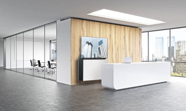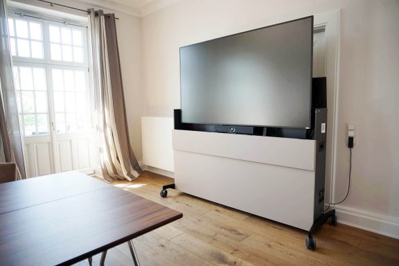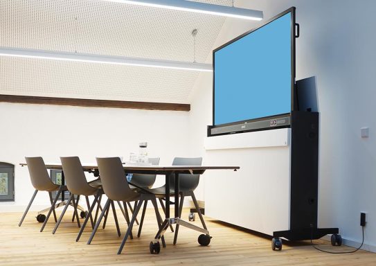 Für Bildschirme ab 65" wurde ein doppeltes Hubsystem entwickelt, an denen schwere Bildschirme schwingungsfrei angehängt werden können. Die leisen Hubsäulen sind leistungsstark und mit einem Kollisionssensor ausgestattet.