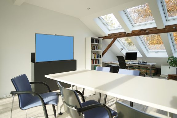 Die Kombination mit Tisch und Bildschirmboard ist die ideale Lösung für den kleinen Besprecheungsraum. Die Tischlänge kann variabel bestellt werden – für 2 bis 8 Personen. Der Monitor ist ca. 1 Meter breit (43") und von der Größe völlig ausreichend für die Teilnehmer am Tisch. Das Bildschirmboard lässt sich mit modernster Medientechnik ausstatten (Videokonferenz und kabellose Netzwerktechnik) und mit einem Touch-Bildschirm versehen.