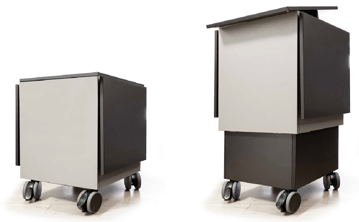 Dieses Möbel ist ein Verwandlungskünstler. Vom unscheinbaren Cubus auf Rollen wächst es über sich hinaus zu einem vollwertigen Arbeitspult oder Rednerpult. Diee elekromechanische Teleskop-Hubsäule lässt die Arbeitsfläche millimetergenau auf die Körpergröße einstellen. Es kann eine hochwertige Audioanlage installiert werden, die das Mikrofonsignal (Funkmikro oder Schwanenhalsmikro) optimal widergibt.  Die hängenden Tischplatten lassen sich hochklappen und verdreifachen die Arbeitsfläche.