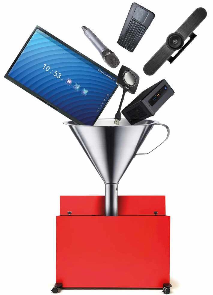 Mit interaktivem Bildschirm, kabelloser Netzwerktechnik und Videokonferenz-Kamera.