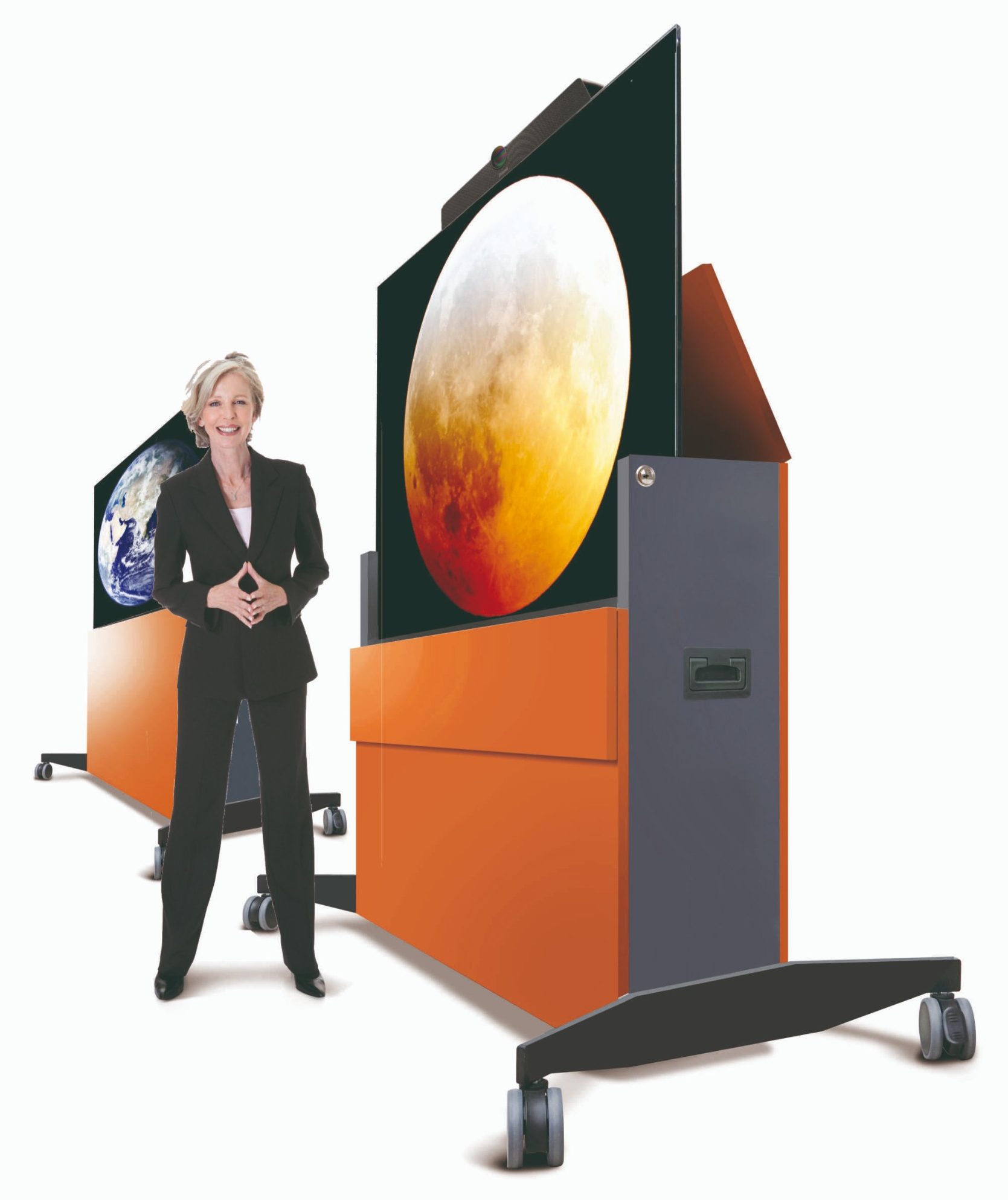 Dieses Möbel ist ein Verwandlungskünstler. Vom unscheinbaren Cubus auf Rollen wächst es über sich hinaus zu einem vollwertigen Arbeitspult oder Rednerpult. Diee elekromechanische Teleskop-Hubsäule lässt die Arbeitsfläche millimetergenau auf die Körpergröße einstellen. Es kann eine hochwertige Audioanlage installiert werden, die das Mikrofonsignal (Funkmikro oder Schwanenhalsmikro) optimal widergibt.  Die hängenden Tischplatten lassen sich hochklappen und verdreifachen die Arbeitsfläche.